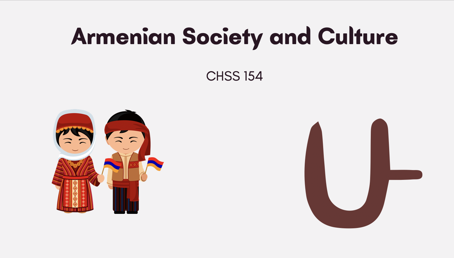 The course explores the development of Armenian society and culture through a comparative perspective. Topics include but are not limited to mythology, language, art, literature, education, and history. Lectures and discussions will focus on the formation of Armenian communities throughout the world; societal changes both in Armenia and within Armenian communities outside of Armenia; Armenia’s interactions with neighboring countries; and the effects and influences of social and cultural events on the formation of the identity of Armenians. Lectures and class discussions will be paired with literature referenced from ancient, medieval, and contemporary scripts, legends, poems, novels, oral history, and some personal accounts of contemporaries.